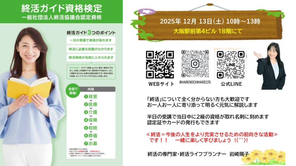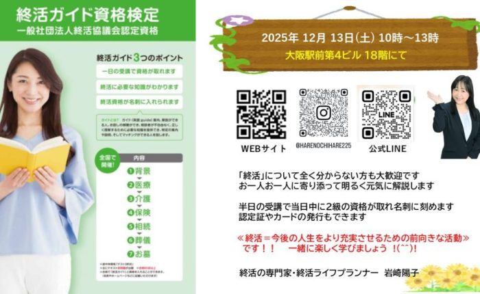 セミナー(終了) 2025年12月13日(土)終活ガイド資格2級検定講座 2025.12.14 2026.01.15 Post Share Line note 記事のタイトルとURLをコピーする 記事のタイトルとURLをコピーする Post Share Line note 2025年11月23日(日)ライフデザイン講座 前の記事 2026年2月15日(日)エンディングノートセミナー開催のお知らせ 次の記事